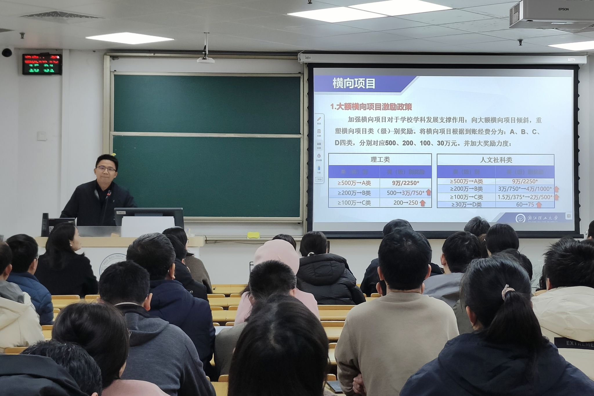随后,科学技术处军工科科长张义玲为学院全体教职工做科技成果转化相关政策解读培训。